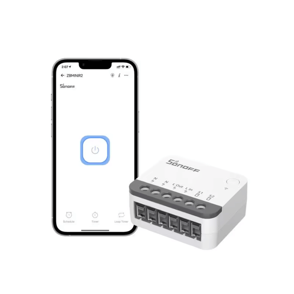 The Sonoff ZBMINIR2 Zigbee switch module offers the ability to control a home appliance/light and repeat the Zigbee signal.