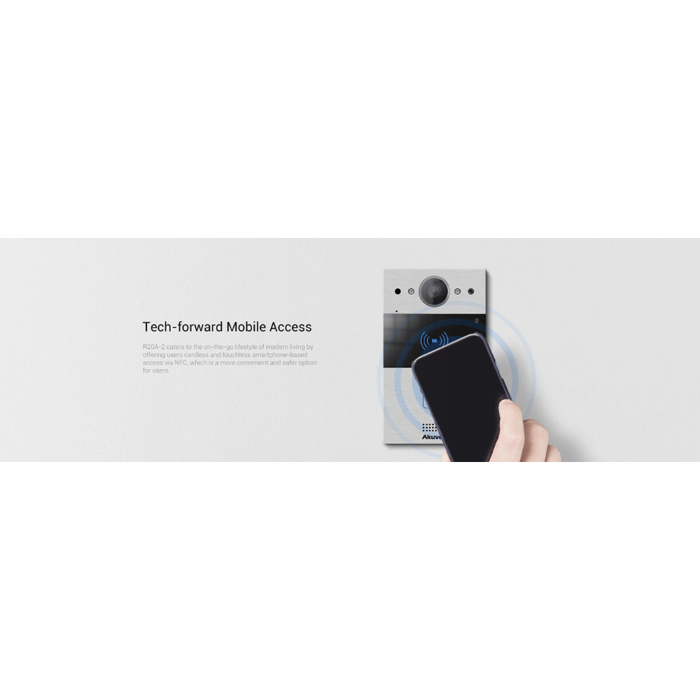 Il videocitofono Akuvox R20A-2 si distingue per le sue dimensioni compatte. Ha una fotocamera ad alta risoluzione, un lettore RFID e NFC.